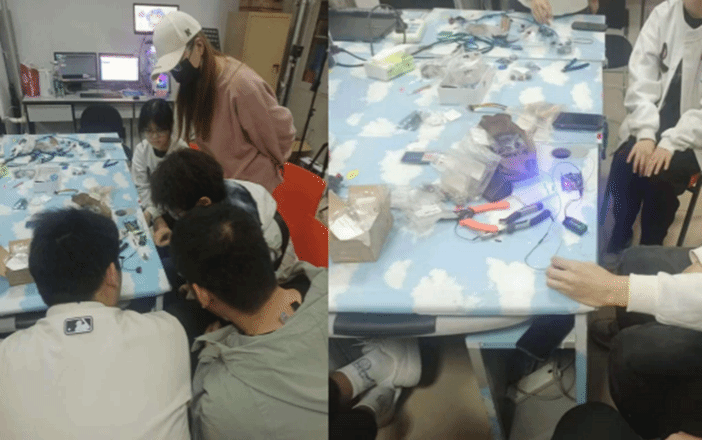 活动现场,各式丰富的器材为同学们提供了广阔的创意空间。同学们围坐在一起,全神贯注地投入活动。面包板、UNO板和Arduino软件的基本功能,以及流水灯、蜂鸣器等生动案例的展示,帮助同学们建立起直观认知。并详细讲解了开发板的结构原理、传感器连接方法以及基础编程语法,现场演示了二极管、滑动变阻器、开关在面包板上的互动效果。