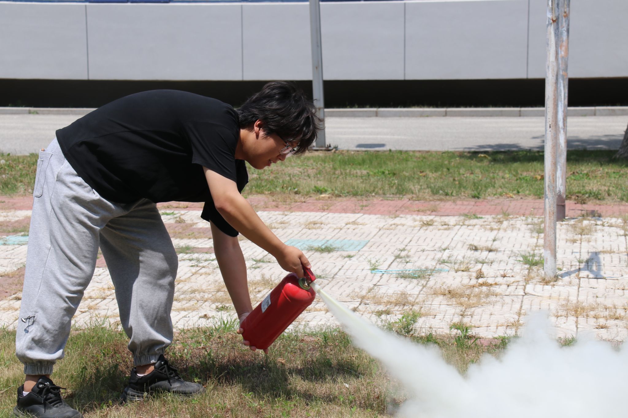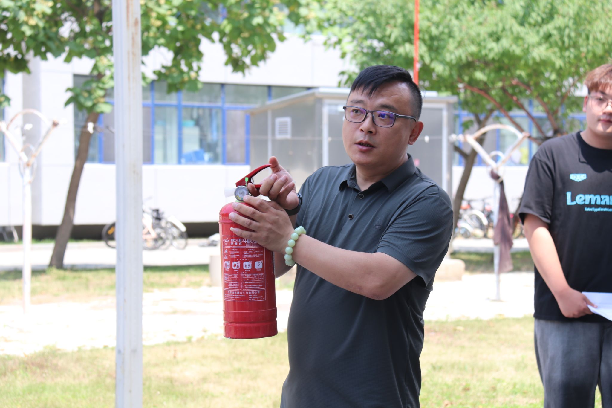 逃生演练结束后,各寝室长依次进行逃生总结。紧接着,保卫处科长田伟为师生详细示范灭火器的正确使用方法,并邀请多名同学代表上台实操。同学们顺利完成灭火器使用流程,通过亲身体验深化了对灭火技能的掌握。