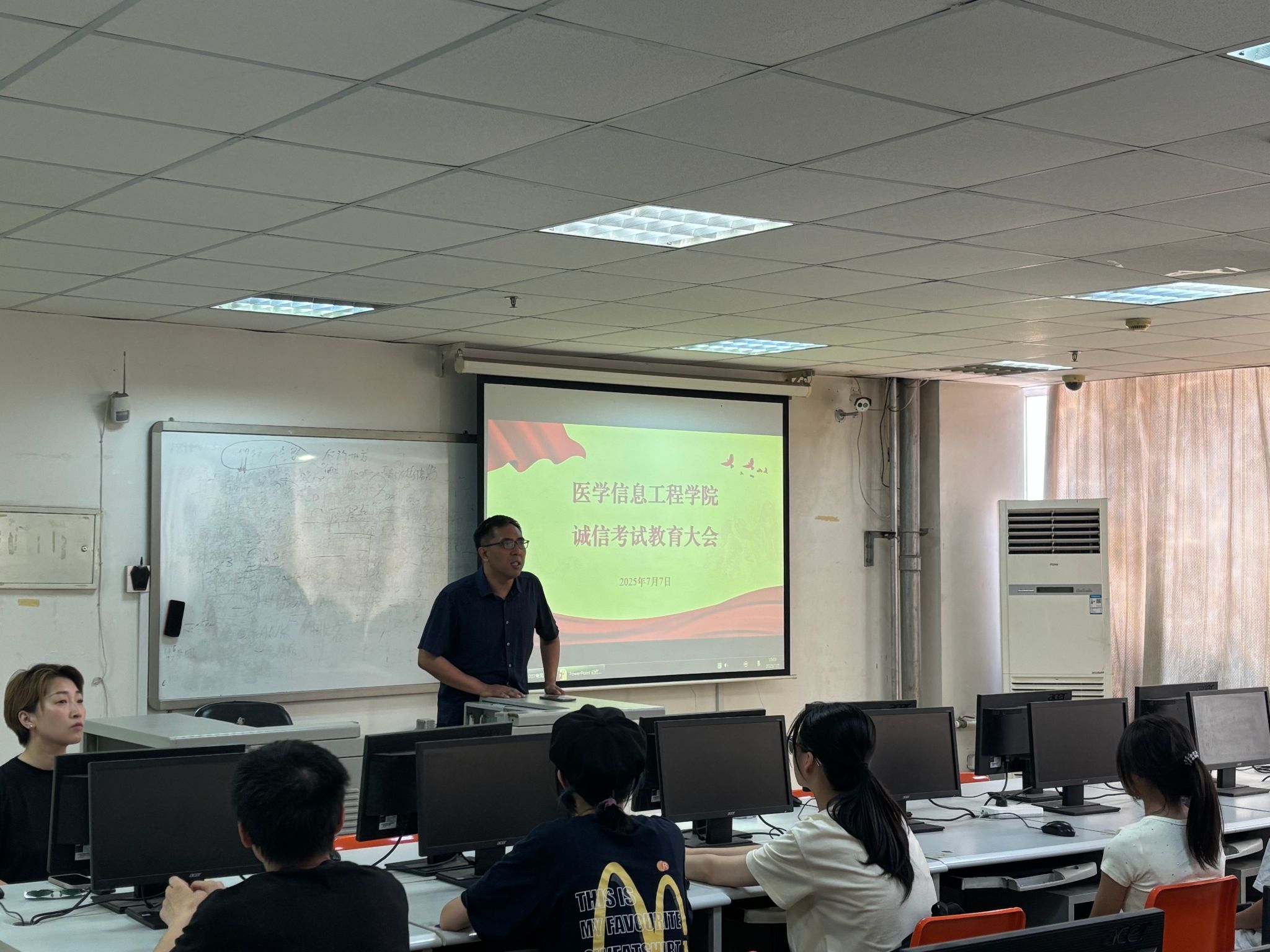 为加强学风建设,营造诚信考试氛围,2025年7月7日,谈球吧在二教220多媒体教室召开诚信考试教育大会。谈球吧经理黄和、辅导员及2023 -2024年级在校员工参会。